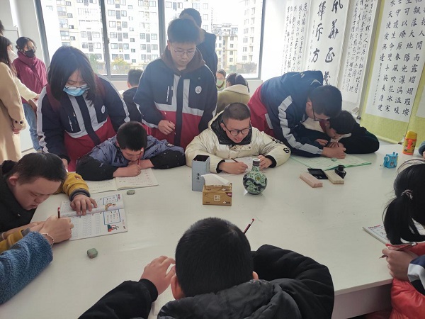 图1-4 志愿者帮助残障儿童完成书法作品