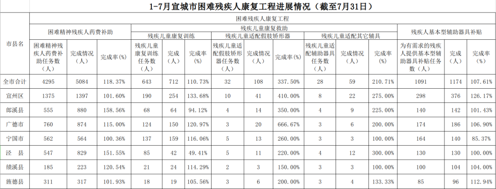 2025年1-7月宣城市困难残疾人康复工程进展情况